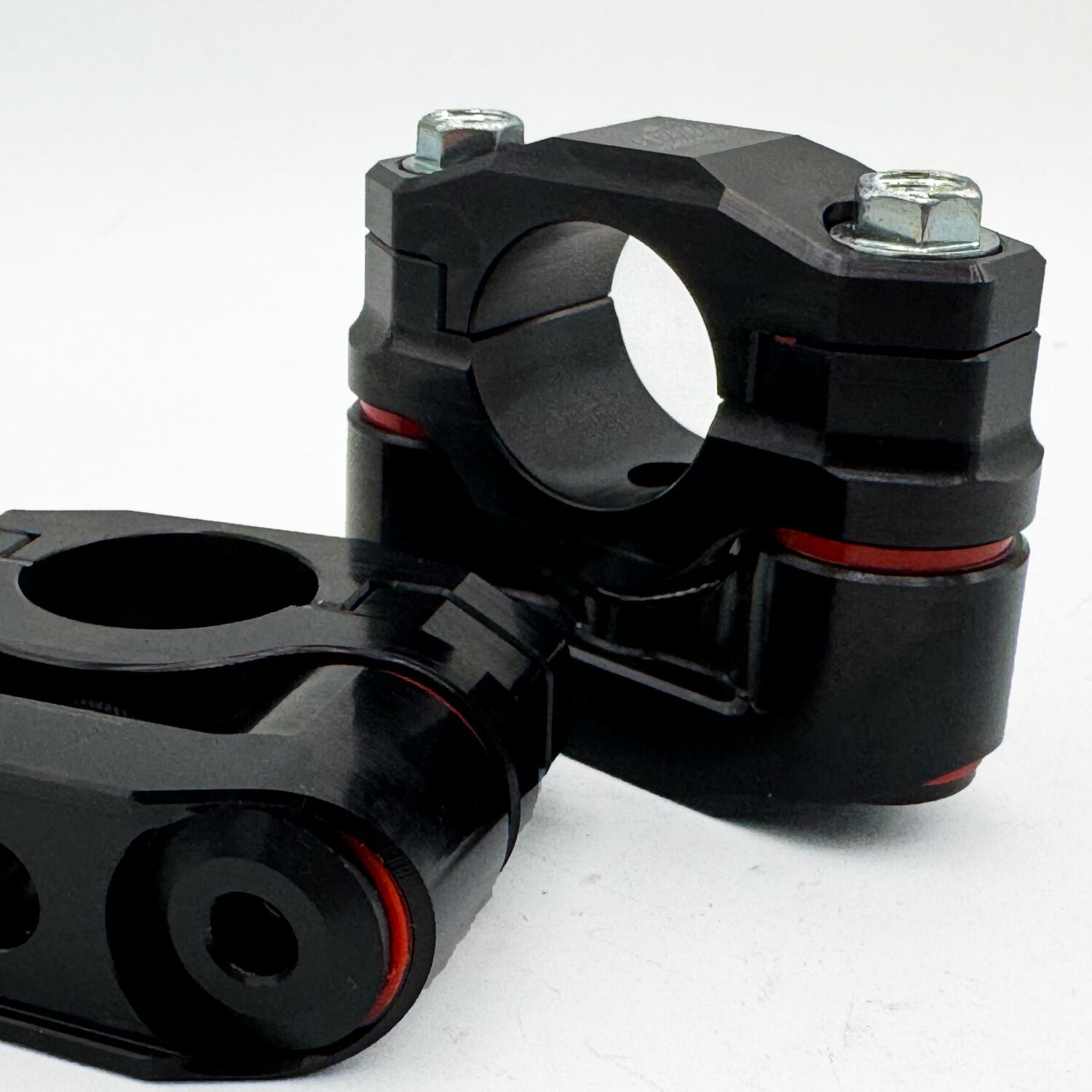 The APEX damping system is unique in its use of four fully damped points on both the upper and lower contact surfaces. Other bar mount systems typically use dampers on only one side, which does not fully absorb vibrations-similar to the basic “rubber-mounted bar systems” found on some OEM bikes. The APEX bar clamps use eight damper cones made from cast polyurethane, offering superior durability compared to natural rubber while maintaining highly effective damping characteristics.